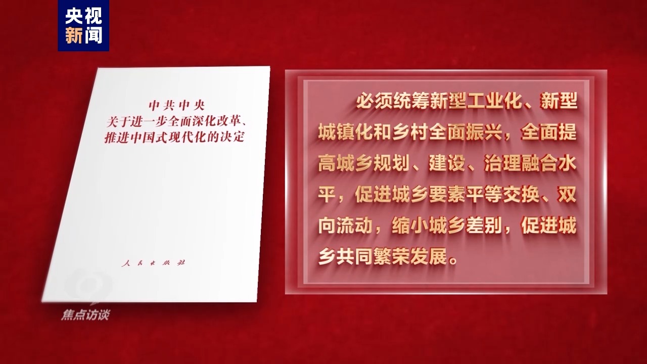 城乡融合发展是中国式现代化的必然要求。《决定》提出,必须统筹新型工业化、新型城镇化和乡村全面振兴,全面提高城乡规划、建设、治理融合水平,促进城乡要素平等交换、双向流动,缩小城乡差别,促进城乡共同繁荣发展。