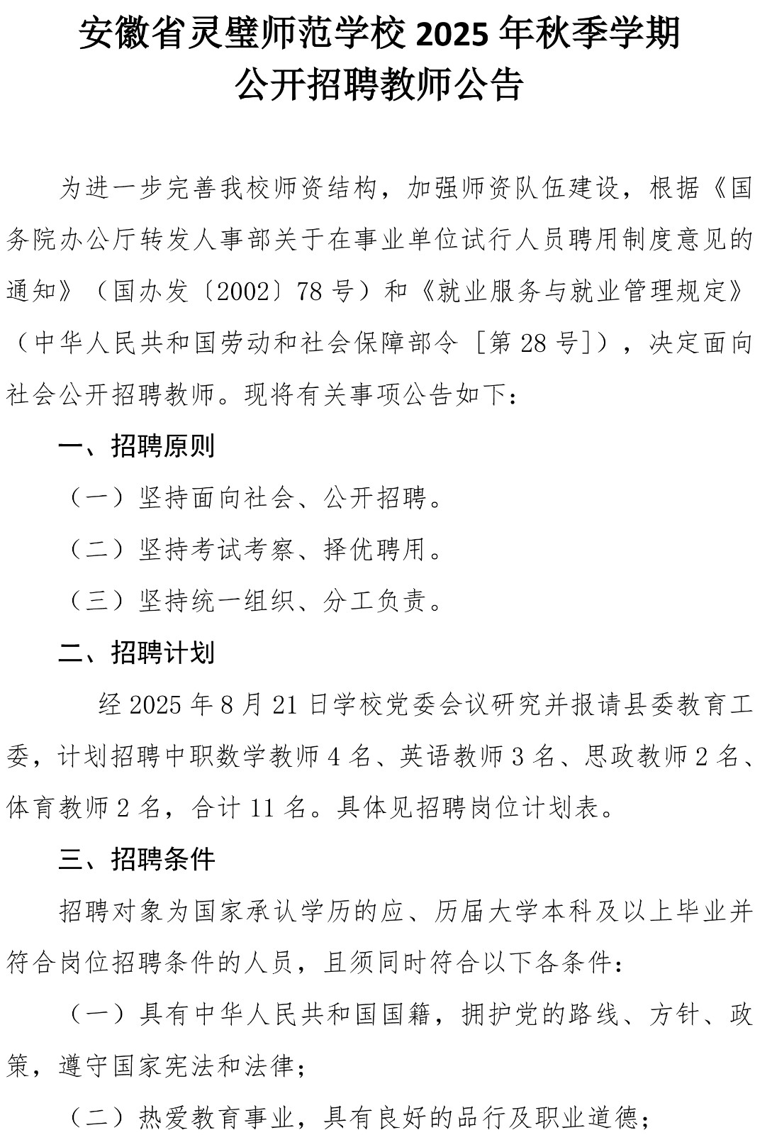 灵璧师范学校2025年秋季学期公开招聘教师公告